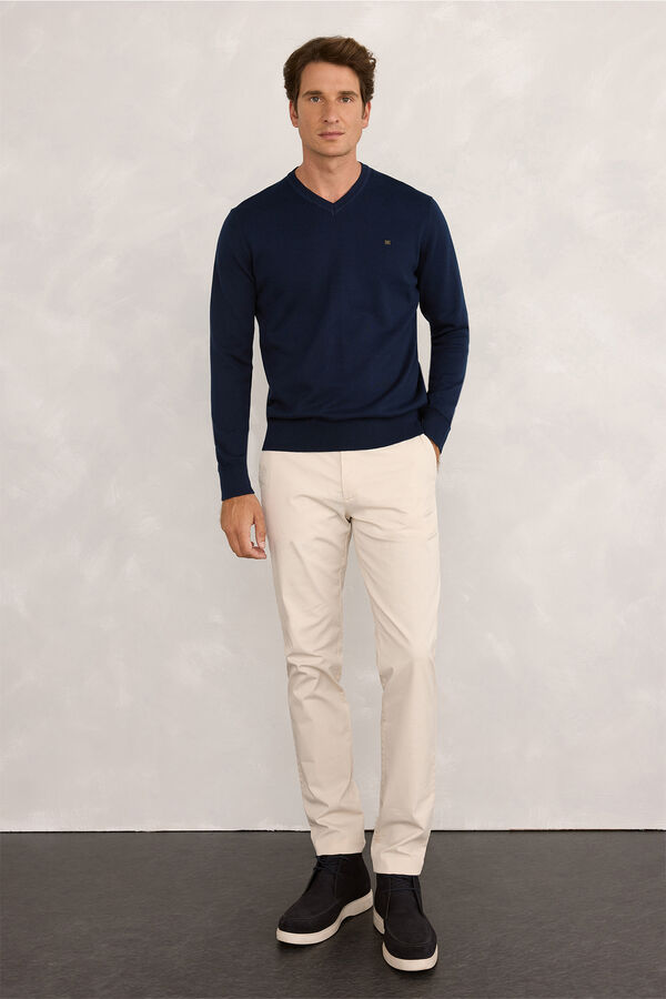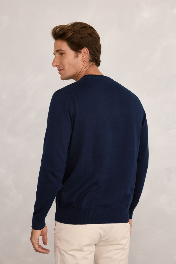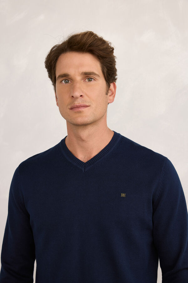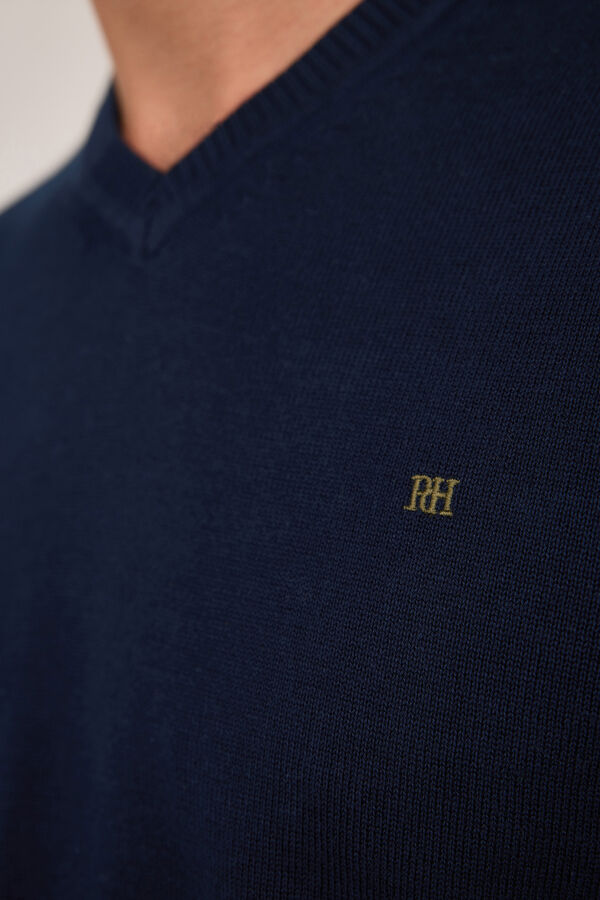 Camisola básico com gola em V, confeccionado em 100% algodão sustentável. Logo bordado no peito e bordado na gola e nas manga.