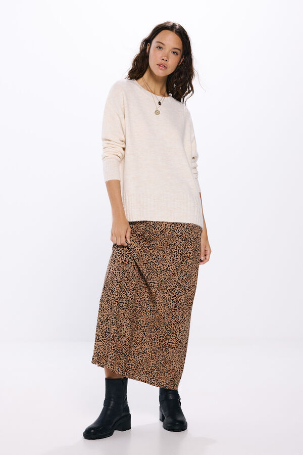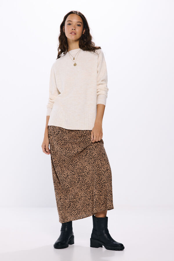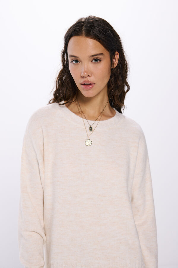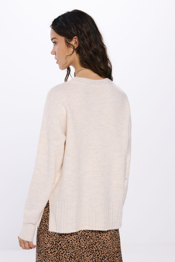 Suéter reto de manga comprida , com gola redonda, com detalhe de riscas em relevo na gola , punhos e baixo, com abertura nas laterais.