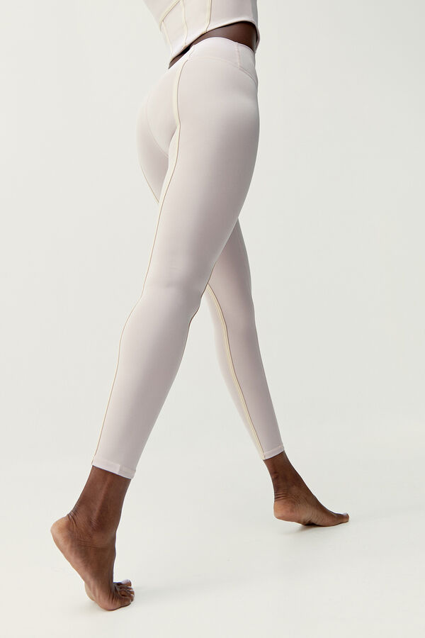 Leggings 7/8 bicolor. Tecido “Shapplex_B”. Cintura alta com corte em “V” na frente. Piping na parte dianteira e nas costas, criando um estilo retro e sofisticado.