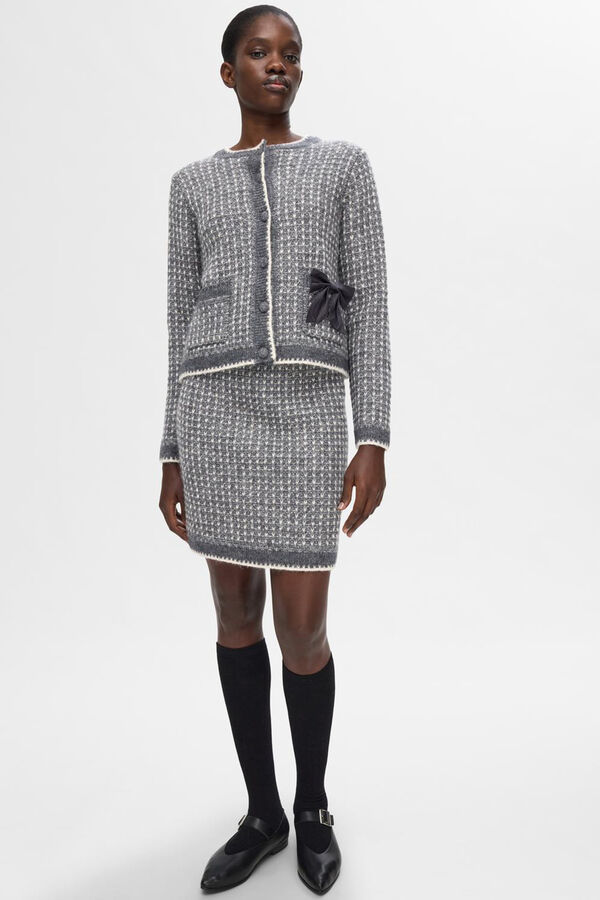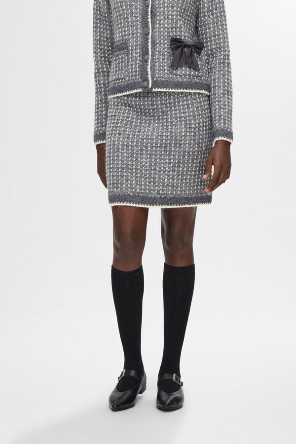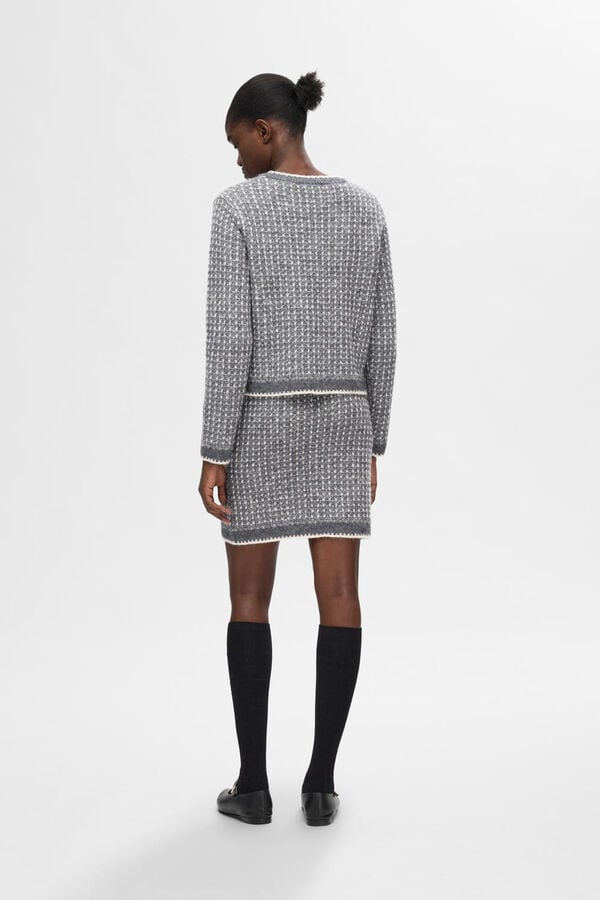 Saia estruturada confeccionada em Lã RWS e Alpaca. Cintura subida. Forro interior. Cintura elástica. Cardigã combinando disponível para criar o look total.