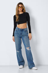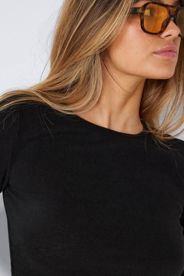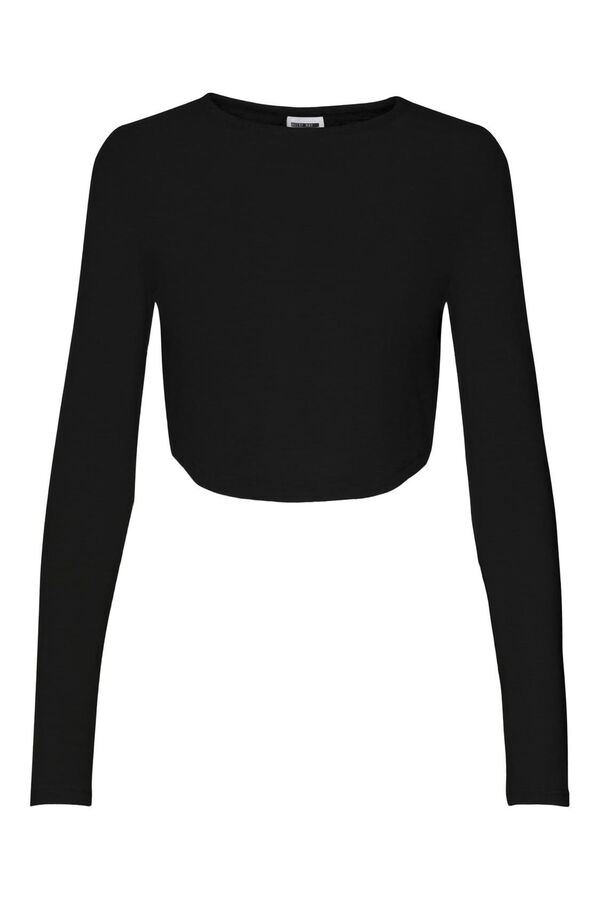 Top curto de decote redondo e mangas compridas.