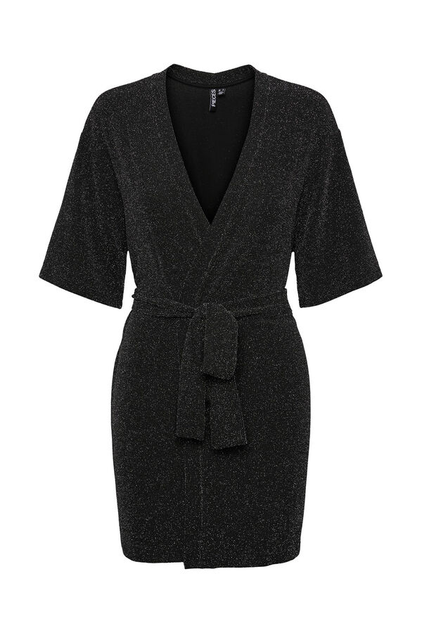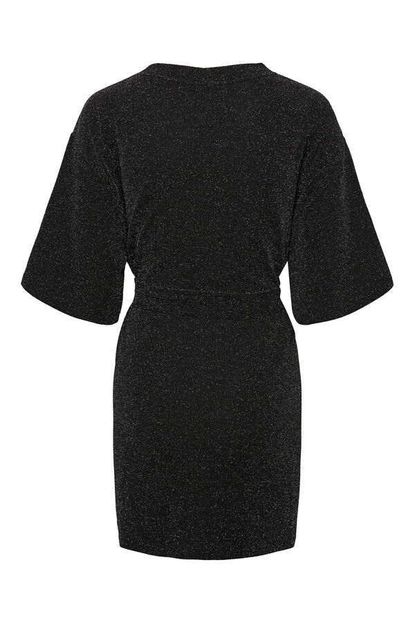 Vestido de manga curta e decote em bico com fibras metálicas. Detalhe de laço na cintura para ajustar.