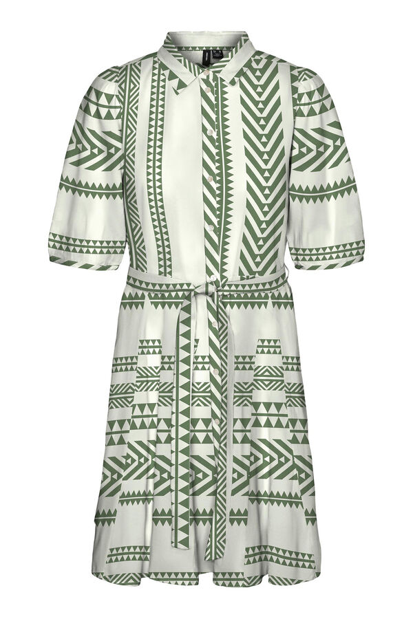 Vestido curto de algodão de manga 2/4 abalonada, fecho frontal abotoado e detalhe de cinto ajustável.