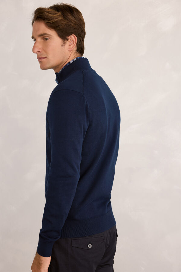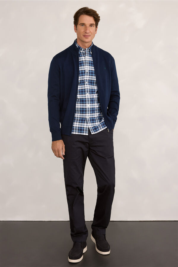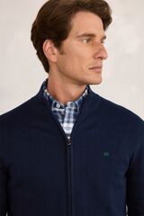 Cardigan básico confeccionado en 100% algodón sostenible. Boradado en el pecho en el mismo color, tapeta para la cremallera escondida.