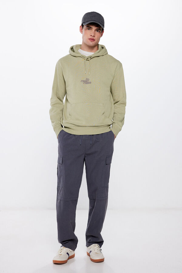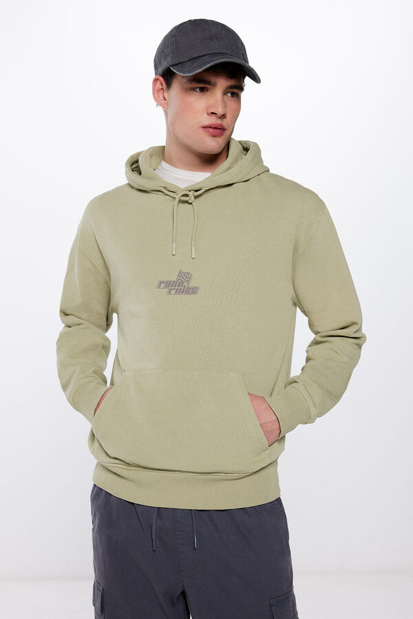 Sudadera con capucha loose fit con cordones al tono, estampado en delantero y espalda, efecto lavado en prenda.