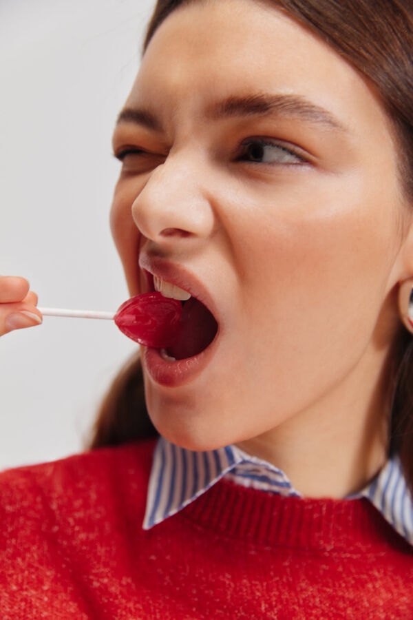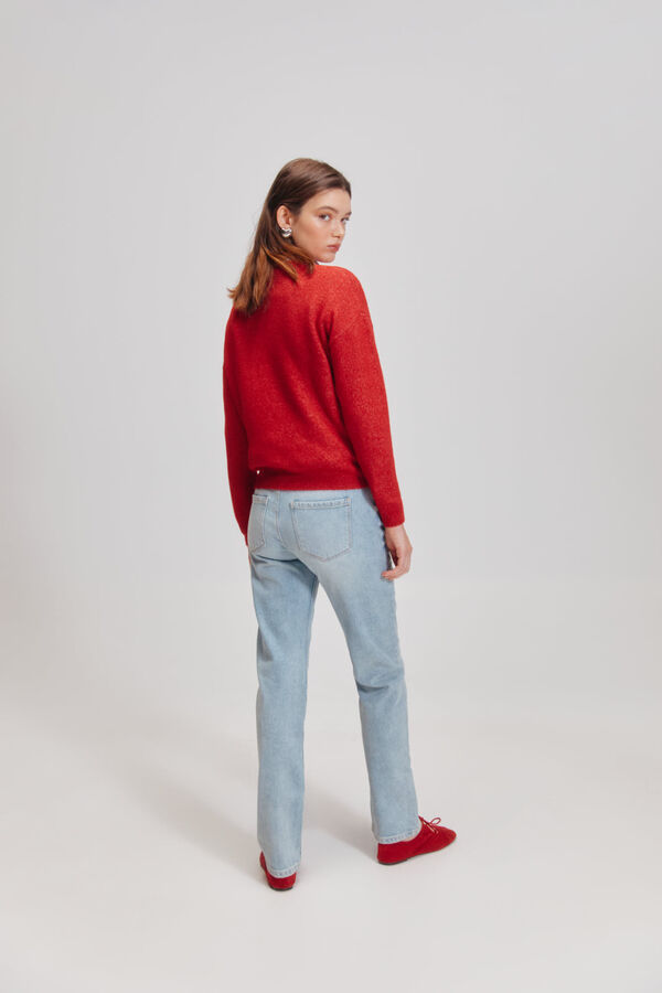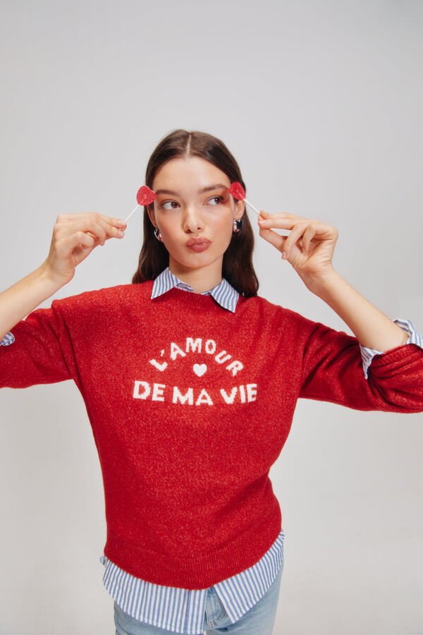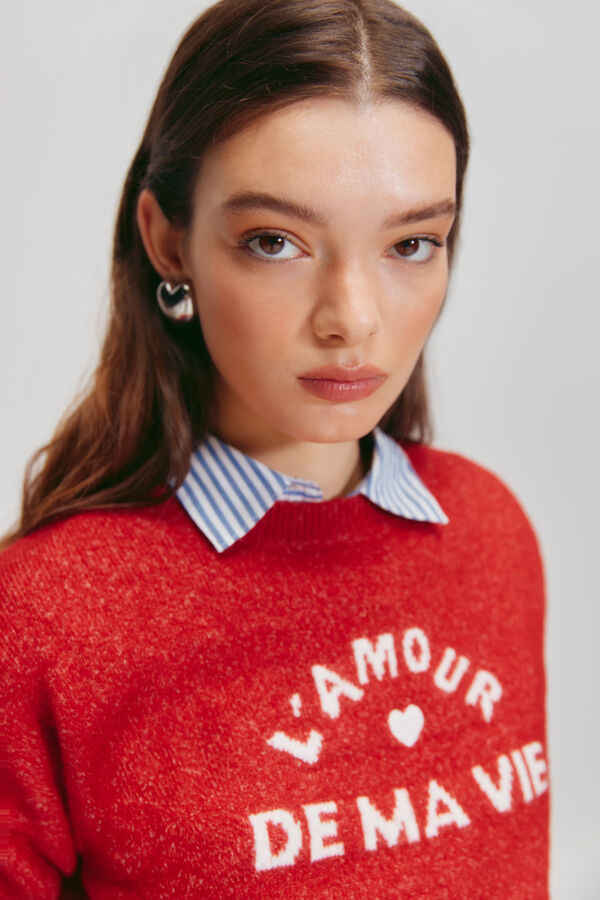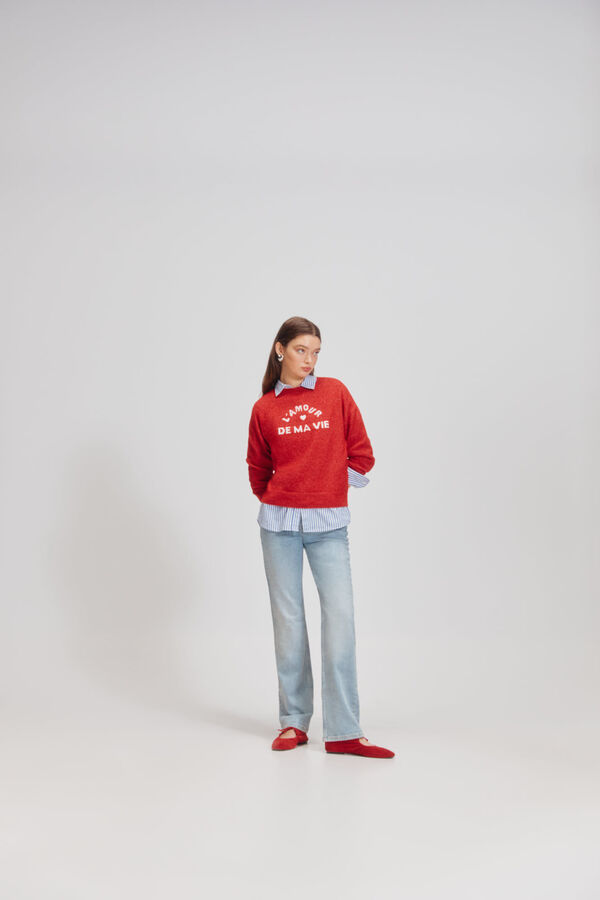 Jersey de manga larga caída, con cuello redondo, con intarsia de texto en el delantero, con canalé en el cuello en los puños y en el bajo.
