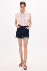 Bermuda denim cinco bolsillos. Bajo decorativo. Cierre con botón y cremallera.