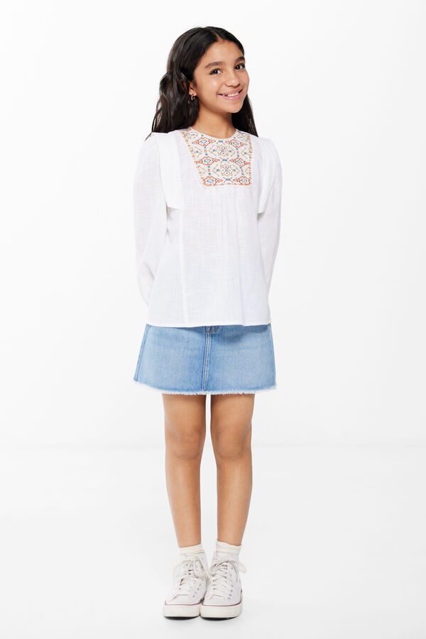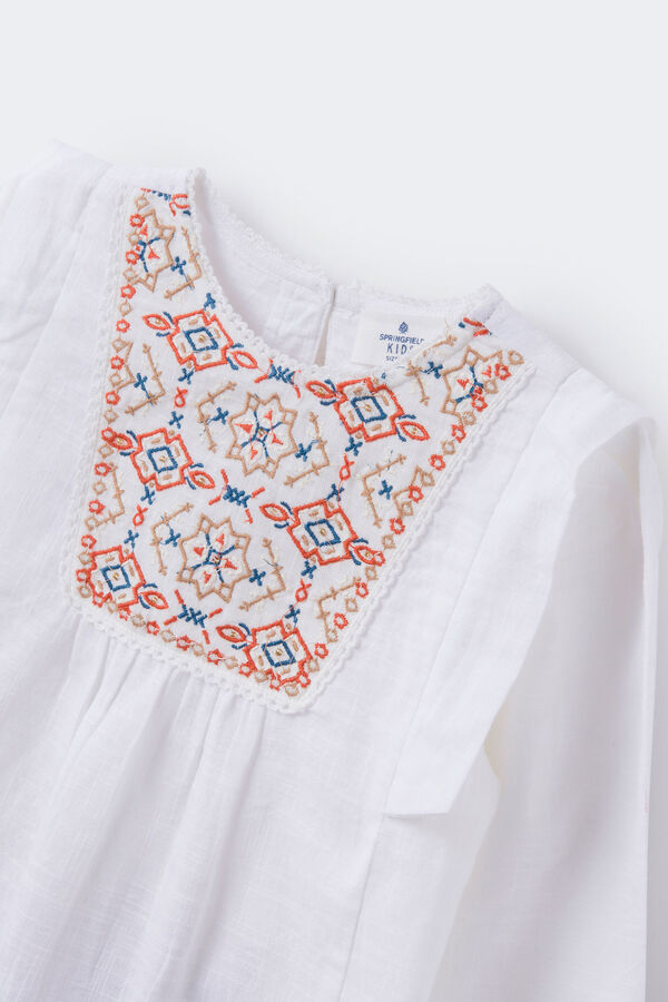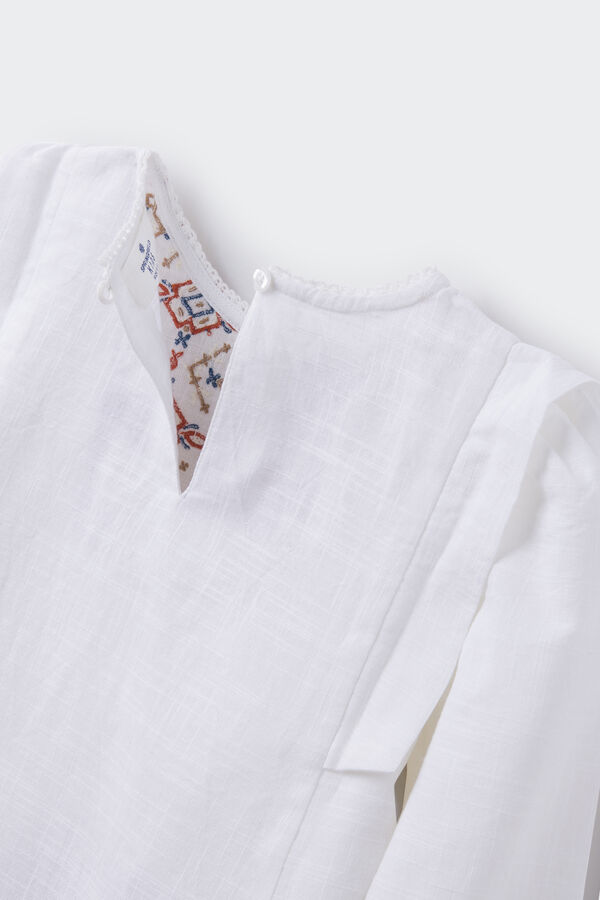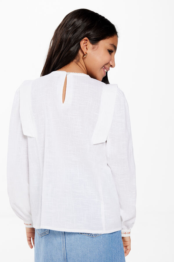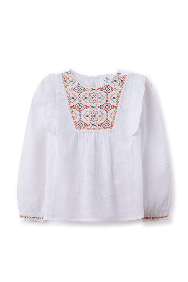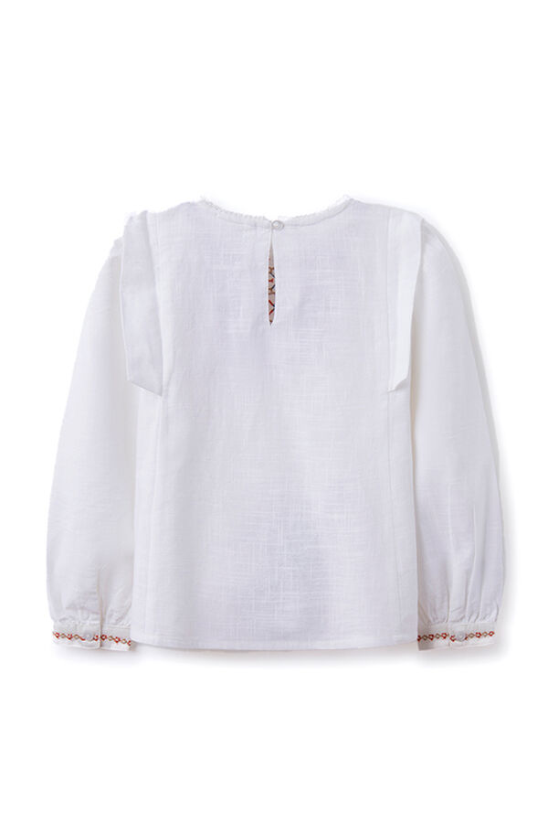 Blusa manga larga para niña en tejido 100% algodón. Cuello pechera con bordados. Volante en hombros. Cierre trasero con botón.