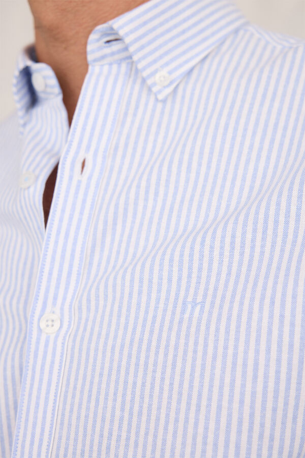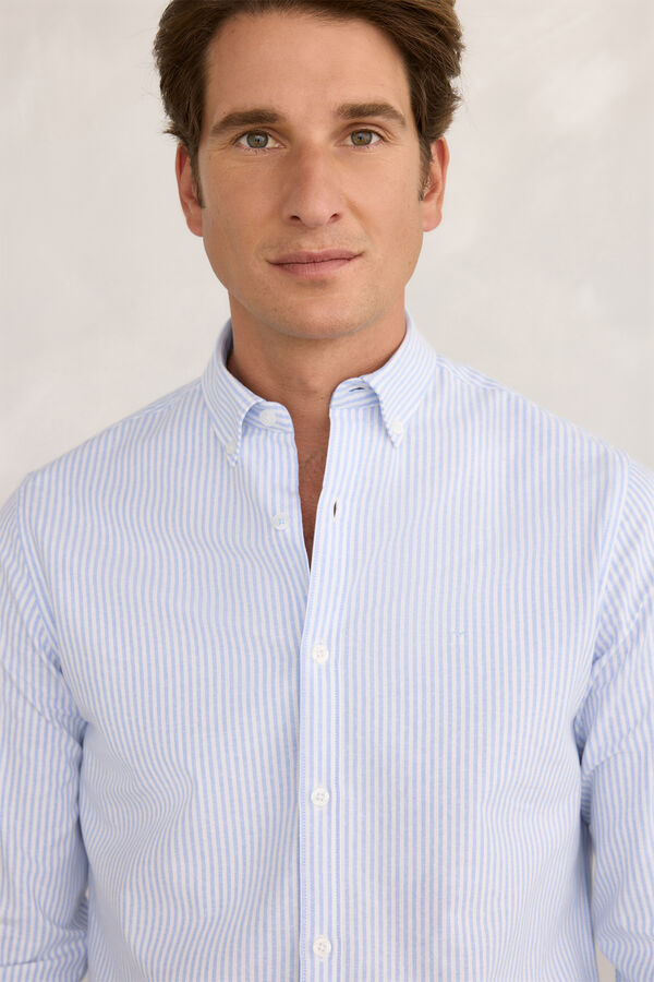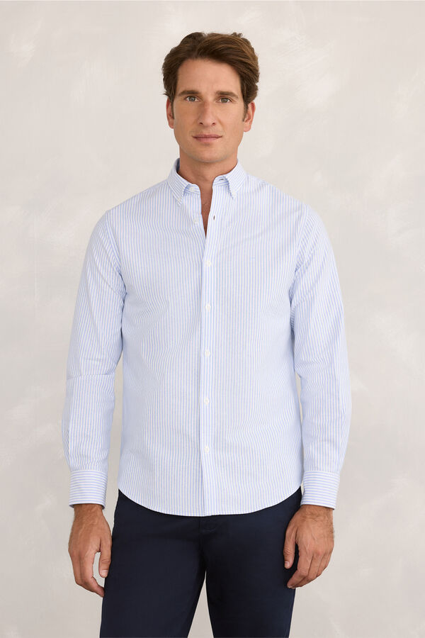 Camisa casual de manga comprida. Confeccionada em tecido Oxford riscas 100% algodão sustentável. Modelagem semi-ajustada com gola abotoada moderna. Manga abotoados duplos para conforto e ajuste.