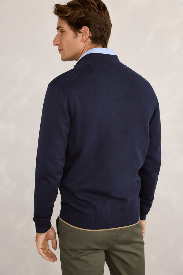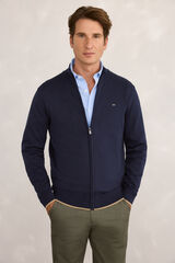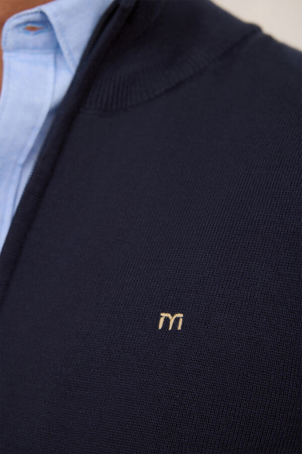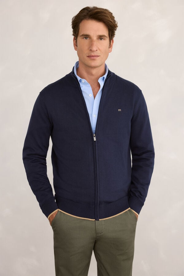 Cardigan confeccionado em mistura de algodão para maior conforto, com estrutura canelada em toda a peça. Bordado com cores coordenadas no peito e carcela com fecho-éclair oculto.