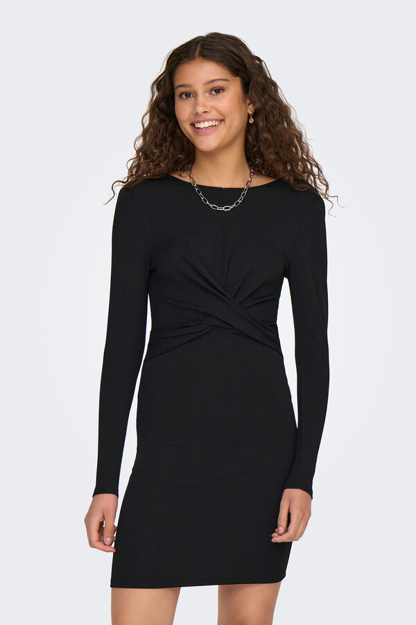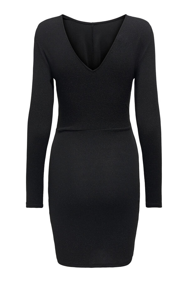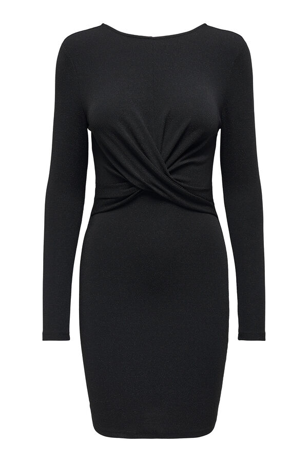 Vestido de manga comprida com gola redonda aberta e tecido de strass.