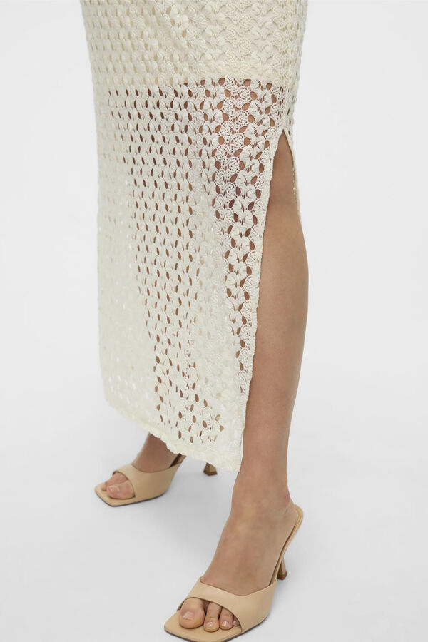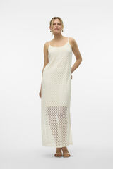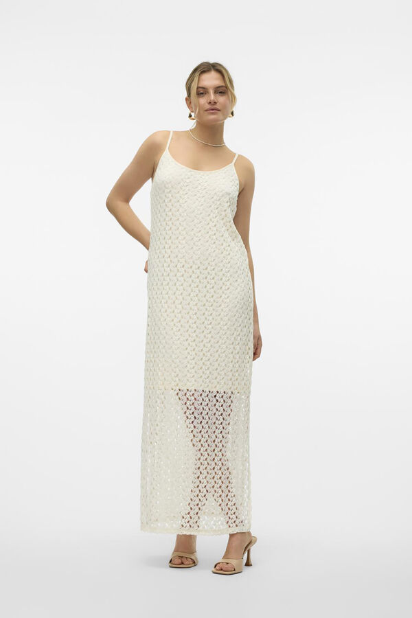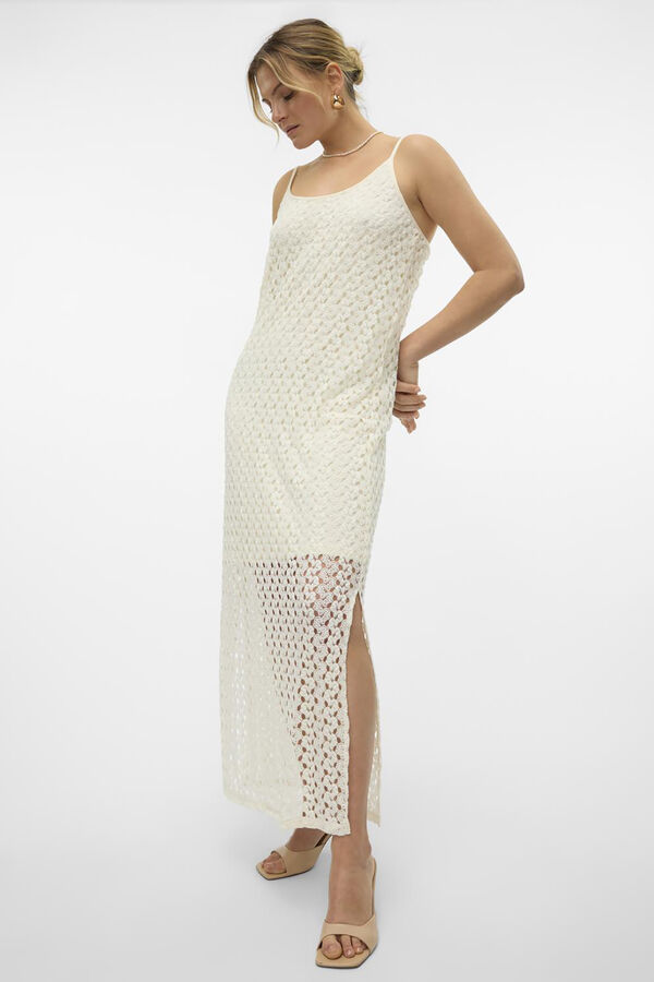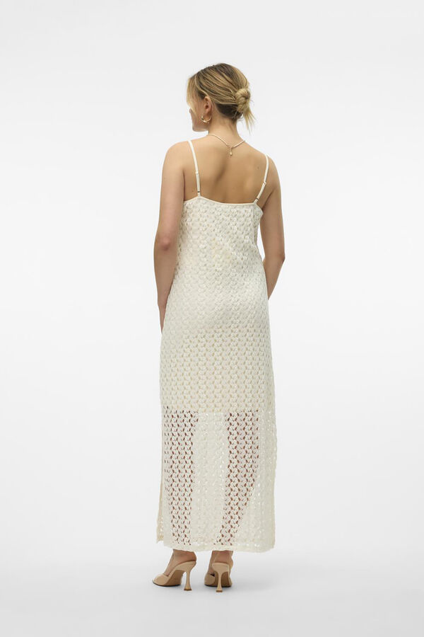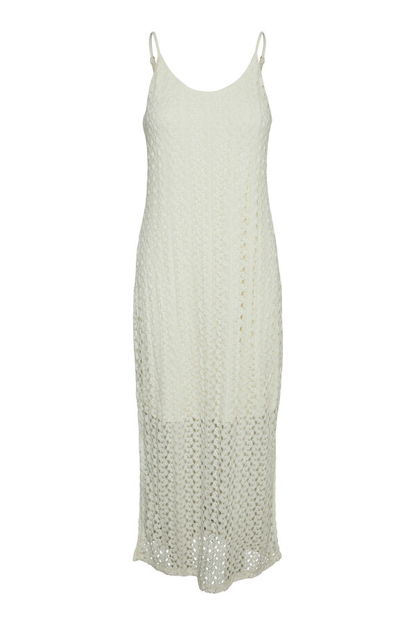 Vestido midi de alça ajustável e decote redondo. Tecido com estrutura de rendilhados.